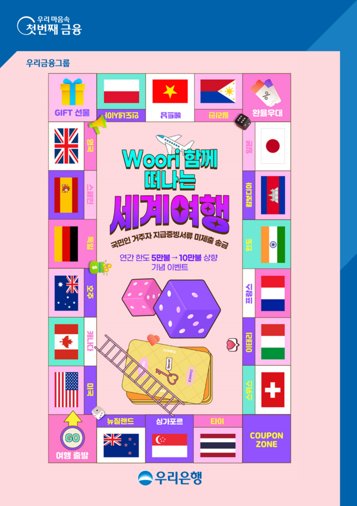 ▲ 우리은행이 지급증빙서류 미제출 해외송금 한도가 10만달러로 상향돼 ‘Woori 함께 떠나는 세계여행’ 이벤트를 실시한다. [이미지=우리은행] |