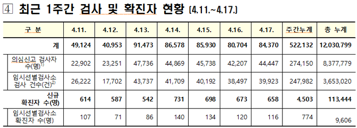 ▲ 최근 1주간 검사 및 확진자 현황. [출처= 중앙방역대책본부] |