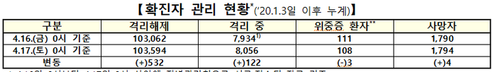 ▲ 17일 0시 기준 코로나19 확진자 관리 현황. [출처= 중앙방역대책본부] |