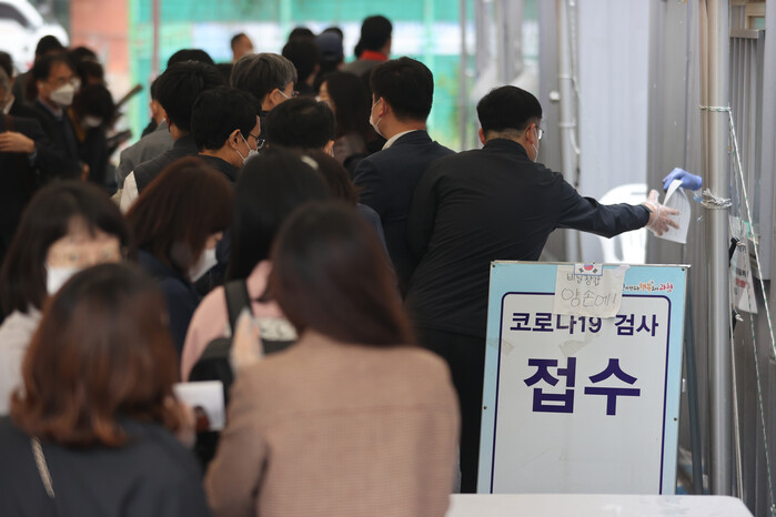 ▲ 법무부에서 코로나19 확진자가 발생한 16일 오전 경기도 과천 법무부 청사 인근에 위치한 과천보건소 선별진료소에서 시민 및 법무부 직원들이 검사를 받기 위해 줄을 서 있다. [과천= 연합뉴스] |