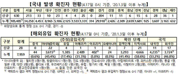▲ 17일 0시 기준 코로나19 국내발생 및 해외유입 확진자 현황. [출처= 중앙방역대책본부] |