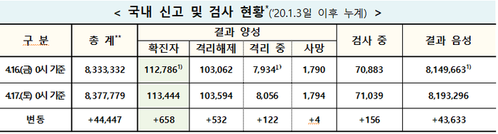 전날 하루 선별진료소를 통한 의심검사 건수는 4만4447건으로, 직전일(4만2207건)보다 2240건 많다. 총 누적 의심검사 건수는 837만7779건으로 늘었다.