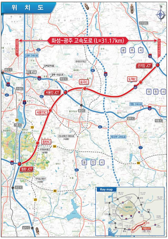 17일 국토교통부에 따르면, ‘화성~광주 고속도로’는 경기 화성시 동탄면 방교리에서 광주시 도척면 진우리를 연결하는 총 연장 31.2km의 왕복 4차로 민자 고속도로로 건설됐다.