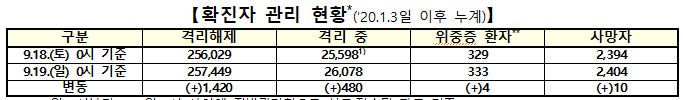 ▲ 19일 0시 기준 코로나19 확진자 관리 현황. [출처=중앙방역대책본부] |