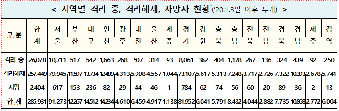 ▲ 19일 0시 기준 코로나19 지역별 격리 및 사망자 현황. [출처=중앙방역대책본부] |
