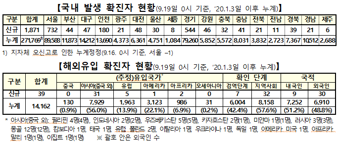 ▲ 19일 0시 기준 코로나19 국내발생(지역발생) 및 해외유입 확진자 현황. [출처=중앙방역대책본부] |
