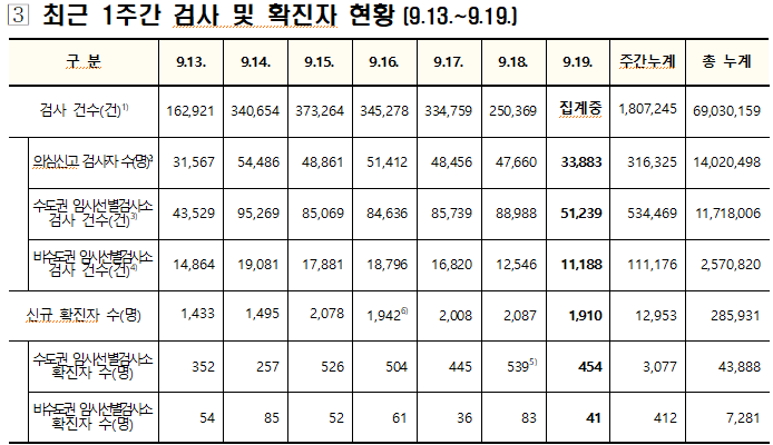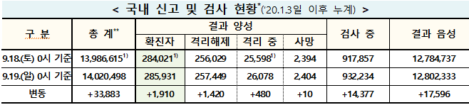 중앙방역대책본부(방대본)는 19일 0시 기준 신규 확진자가 1910명 추가 발생해 누적 28만5931명(해외유입 1만4162명)으로 집계됐다고 밝혔다.