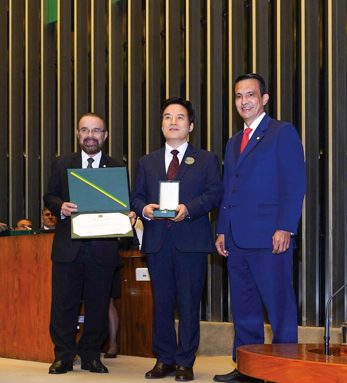 ▲국회의사당에서 열린 시상식에서 링콘 포르텔라 연방하원의원 제1부의장과 하나님의 교회 총회장 김주철 목사, 시드니 레이치 하원의원(왼쪽부터)이 기념촬영을 하고 있다. |
