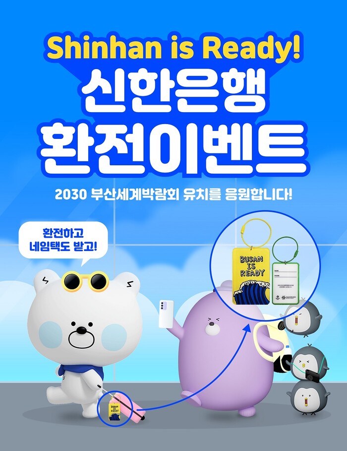 ‘SHINHAN IS READY’ 환전 이벤트는 인천국제공항, 김포국제공항 환전소에서 원화 50만원 이상 환전하는 고객을 대상으로 2030 부산세계박람회 유치 응원 메시지‘BUSAN IS READY’가 새겨진 여행 가방 네임택을 제공하는 이벤트다. 신한은행 인천국제공항 환전소에서는 선착순 고객 4000명, 김포국제공항에서는 선착순 고객 1000명에게 네임택을 제공한다.