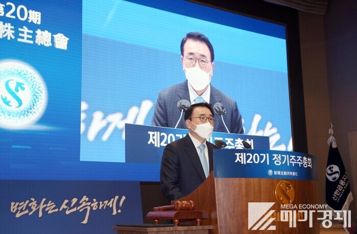 | ▲ 25일 개최된 신한금융지주 주주총회에서 조용병 회장은 인사말을 통해 Digital과 ESG 관점에서 금융의 미래를 선도하는 변화를 신속하게 추진해, 코로나가 몰고 온 복합적 불확실성 시대에 누구보다 기민하게 대응하고 당면한 위기를 새롭게 혁신할 기회로 바꿔 나가겠다고 말했다. [사진=신한금융지주 제공] |