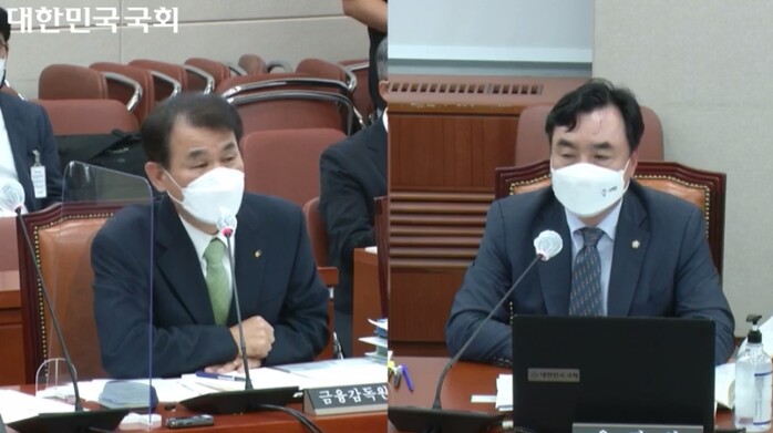 | ▲ 7일 국회 정무위원회 국정감사에서 윤관석 더불어민주당 의원(사진 오른쪽)이 머지포인트 사태와 관련해 질의하자 정은보 금융감독원장이 답변하고 있다. [사진=국회의사중계 캡쳐] |