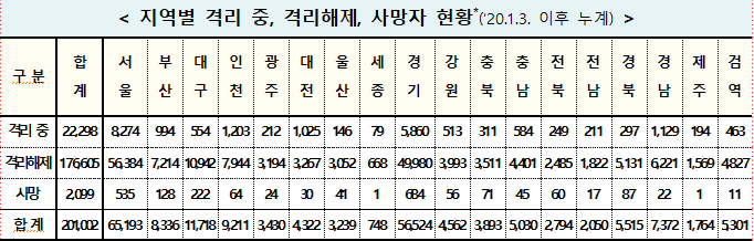 ▲ 2일 0시 기준 코로나19 지역별 격리 및 사망자 현황. [출처=중앙방역대책본부] |