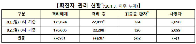 ▲ 2일 0시 기준 코로나19 확진자 관리 현황. [출처=중앙방역대책본부] |