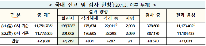 중앙방역대책본부(방대본)는 2일 0시 기준으로 코로나19 신규 확진자가 1219명 발생해 누적 확진자는 20만1002명으로 20만명을 넘어섰다. 누적 확진자 중 해외유입은 1만2020명이다.
