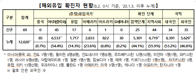 해외유입 확진자 69명 중 25명은 입국 검역단계에서 확인됐고, 44명(경기 9명, 경남 7명, 부산·경북 각 4명, 서울·인천·충남·전남 각 3명, 대전·전북 각 2명, 광주·울산·세종·강원 각 1명)은 지역사회에서 자가격리중 확진됐다. 국적별로는 내국인 34명, 외국인 35명이다.