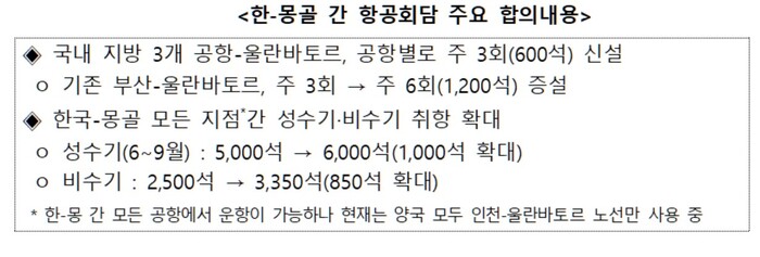 이번 한-몽골 간 합의를 통해 향후 새롭게 국내 3개의 지방공항(공항은 추후 지정)에서 공항별로 주 3회(600석)씩 울란바토르 노선을 운항할 수 있게 됐다.