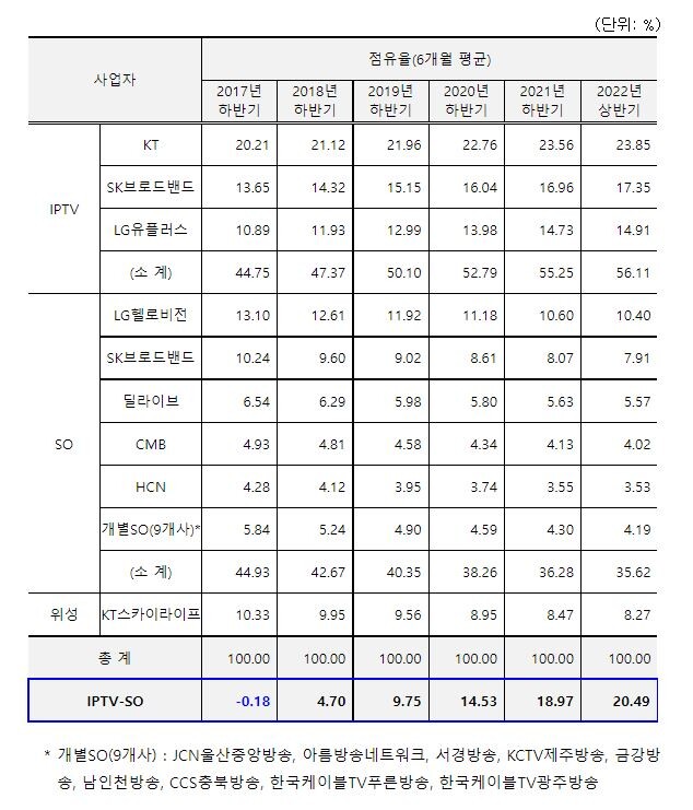 매체별 시장점유율이 IPTV가 56.11%로 절반 이상을 차지했고, SO와 위성방송이 각각 35.62%, 8.27%로 뒤를 이었다.