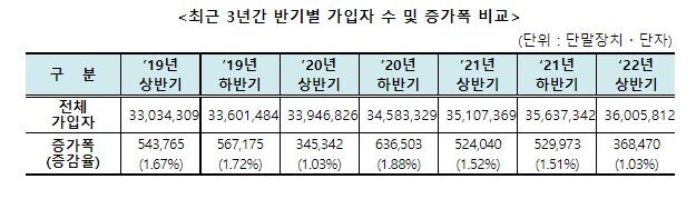유료방송 시장점유율 산정 기준에 따른 올해 상반기 가입자 수는 3600만 5812명(6개월 평균)으로 조사됐다.