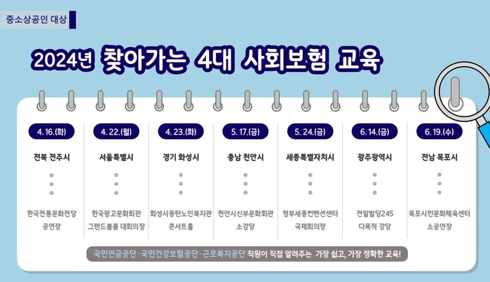 [메가경제=오민아 기자] 국민연금공단(이사장 김태현)은 16일 전주시를 시작으로 6월 19일 목포시까지 7개 지역에서 중소상공인을 대상으로 ‘찾아가는 4대 사회보험 교육’을 실시한다고 밝혔다.
