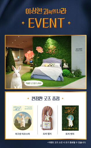 [메가경제=심영범 기자]에이스침대가 오는 3일부터 TV CF 캠페인 ‘이상한 과학의 나라 ACE’의 세계관을 직접 체험할 수 있는 인증샷 이벤트를 오는 진행한다고 2일 밝혔다. 이번 행사는 에이스침대 더현대 서울 4층 매장에 마련된 ‘이상한 과학의 나라 ACE’ 컨셉존에서 진행된다. 먼저 CF 속 판타지 세계를 무대로 한 공간에서 인증샷을 촬영하고, 필수