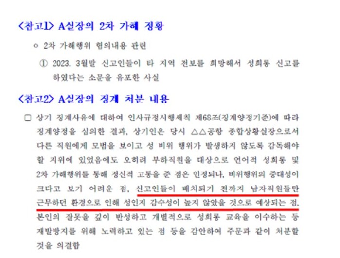 공사의 징계의결서에 따르면 해당 실장은 공항 종합상황실장으로서 다른 직원에게 모범을 보이고 성 비위 행위가 발생하지 않도록 감독해야 할 지위가 있었음에도 오히려 부하직원 대상으로 언어적 성희롱 및 2차 가해행위를 통해 정신적 고통을 준 점이 인정됐다.