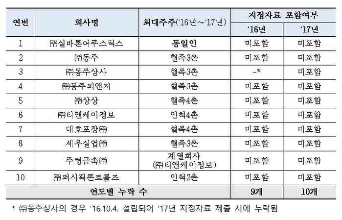 또한 동주, 동주상사, 동주피앤지, 상상, 티앤케이정보, 대호포장, 세우실업, 주령금속, 퍼시픽콘트롤즈 등 10개사 역시 위장계열사로 봤다.