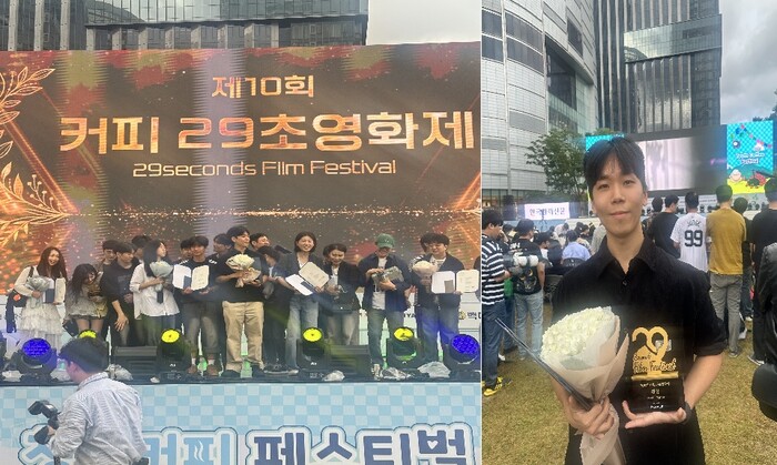 | ▲ 지난 28일 서울 잠실 롯데월드타워 잔디광장에서 열린 '제 10회 커피 29초영화제’에서 통합(일반부+청소년부) 대상의 영예를 안은 소범휘 감독이 기념촬영을 하고 있다. |