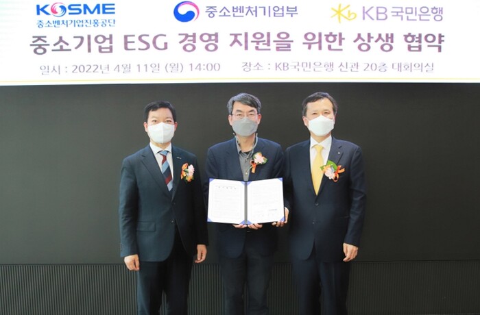 KB국민은행이 중소벤처기업진흥공단과 손잡고 중소기업 ESG 경쟁력 강화 지원에 나선다. 양기관은 협약을 맺고 ESG 실천 기업을 위한 인센티브를 마련하고 ESG 진단·컨설팅 제공을 통해 중소기업의 ESG 경쟁력 강화를 추진할 예정이다.