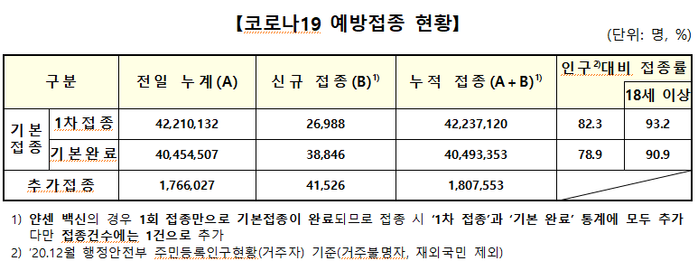코로나19 예방접종대응추진단은 21일 0시 기준으로 전날 보다 1차접종자는 2만6988명이 추가돼 인구 대비 누적 1차접종률이 82.3%(총 4223만7120명)를 보였고, 기본완료접종자는 3만8846명이 늘어 누적 기본완료접종률은 78.9%(총 4049만3353명)라고 밝혔다.