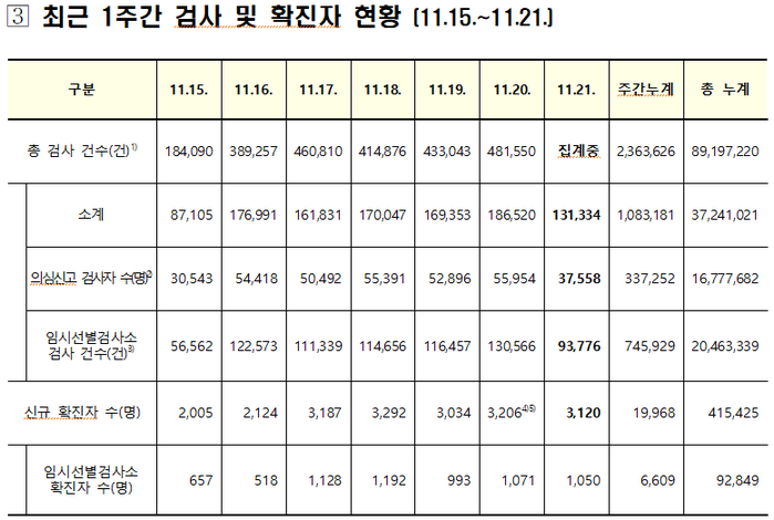 중앙방역대책본부(방대본)는 21일 0시 기준으로 코로나19 신규 확진자가 3120명 발생해 지금까지 누적 41만5425명(해외유입 1만5512명)으로 집계됐다고 밝혔다.