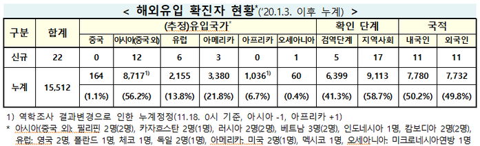 ▲ 21일 0시 기준 코로나19 해외유입 확진자. [질병관리청 제공] |