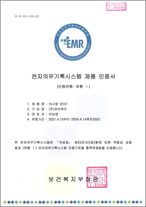 유비케어(대표 이상경)는 전자의무기록시스템(EMR) ‘의사랑’이 보건복지부 산하 재단 법인 한국보건의료정보원으로부터 ‘EMR 국가 표준 인증’을 받았다고 17일 밝혔다. 인증 기간은 오는 2024년 4월까지 3년간이다.