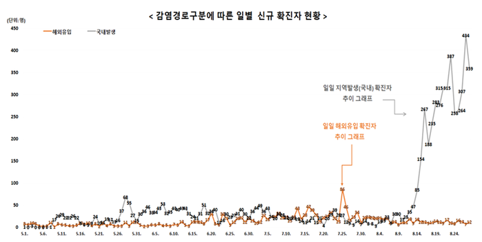 ▲ 감염경로구분에 따른 일별 신규확진자 현황. [출처= 중앙방역대책본부] |
