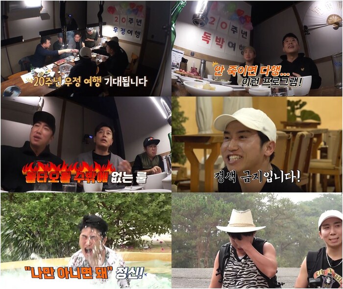 이날 찐친 5인방은 제작진이 마련한 사전 미팅을 위해, 한 식당에 모인다. 하지만 화기애애한 분위기도 잠시, 제작진이 “우리는 이번 여행의 콘셉트를 ‘출연자들이 돈 내는 여행’으로 정했다”라고 기습 발표하자, 장동민은 “여기 삐죽한 거 없어요?”라며 분노한다. 김대희 역시 “무슨 소리야!”라며 핏대를 세워 긴장감을 드리운다.
