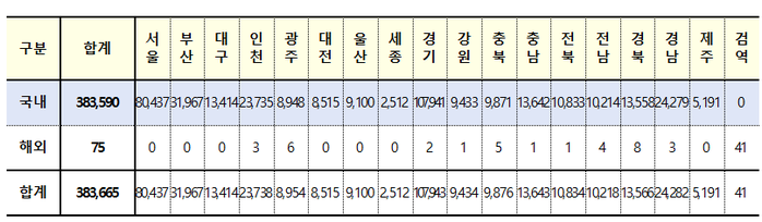 수도권 중 경기(10만7941명)는 국내 처음으로 10만명을 넘었고, 서울은 8만437명, 인천은 2만3735명이었다. 비수도권은 부산이 3만1967명으로 가장 많고, 이어 경남이 2만4279명을 기록했다.