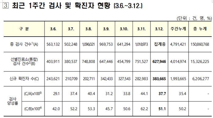 중앙방역대책본부는 12일 0시 기준 코로나19 신규 확진자는 총 38만3665명이 발생해 누적 확진자 수는 총 620만6277명(해외유입 누적 3만206명)으로 집계됐다고 밝혔다.