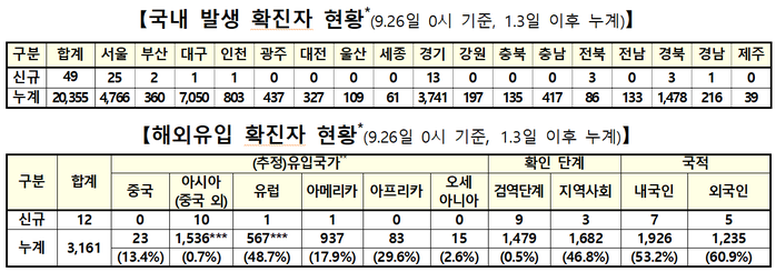 신규 확진자 61명 중 국내발생은 49명이고 해외유입은 12명이다. 해외유입 누적 확진자는 3161명으로 전체의 13.4%를 차지했다.