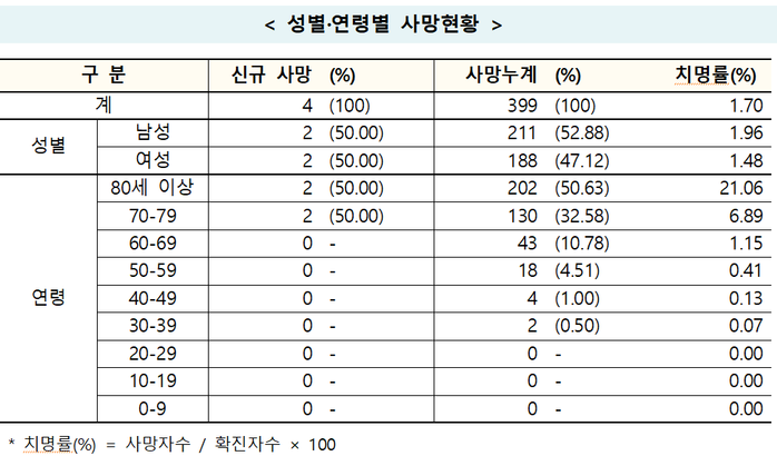 ▲ 성별·연령별 사망현황. [출처= 중앙방역대책본부] |
