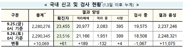 질병관리청 중앙방역대책본부(방대본)는 26일 0시 기준으로, 전날 대비 코로나19 신규 확진자 수가 61명 추가됐다고 밝혔다. 전날(114명)보다 53명이 줄었다.