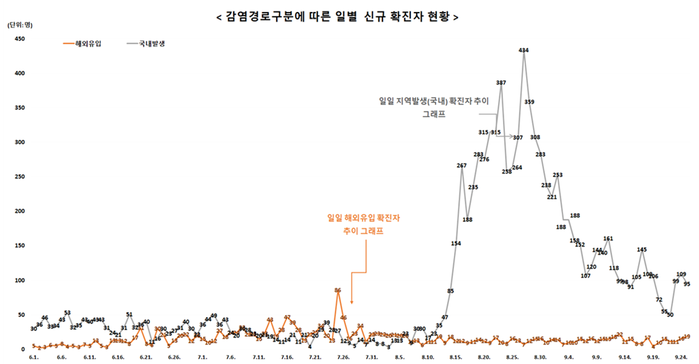 ▲ 감염경로구분에 따른 일별 신규 확진자 현황. [출처= 중앙방역대책본부] |