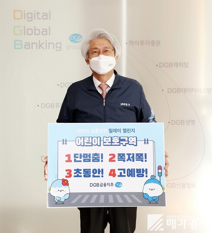 [메가경제=황동현 기자] DGB금융그룹 김태오 회장이 ‘어린이 교통안전 릴레이 챌린지’에 동참하고, 다음 릴레이 주자로 조정목 대구지방국세청장, DGB대구은행 IM뱅크 광고모델 가수 딘딘을 지명했다고 밝혔다.