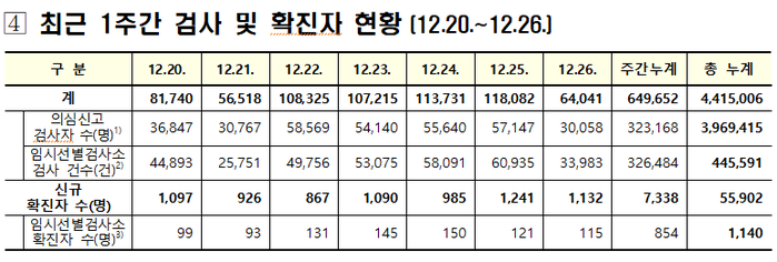 이날 신규 확진자 수는 하루 역대 최다를 기록했던 전날(1241명)보다 109명 줄었다. 그러나 성탄절인 전날 검사 검수가 3만58건으로 직전 평일의 5만7147건보다 47.4%(2만7089건)나 대폭 줄어든 상황에서도 1100명대를 기록해 확산세가 더 가팔라진 것으로 분석된다.