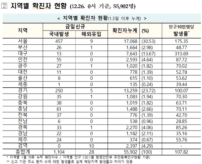 ▲ 26일 0시 기준 코로나19 지역별 확진자 현황. [출처= 중앙방역대책본부] |