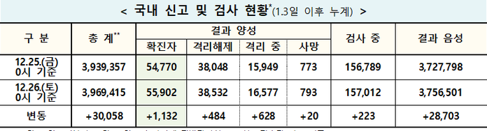 질병관리청 중앙방역대책본부(방대본)는 26일 0시 기준으로 전날 대비 코로나19 신규 확진자가 1132명 추가돼 지금까지 누적 확진자 수가 5만5902명(해외유입 5273명)으로 집계됐다고 밝혔다. 이틀연속 1100명대 이상에 하루 역대 두 번째 기록이다.