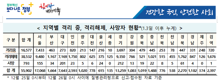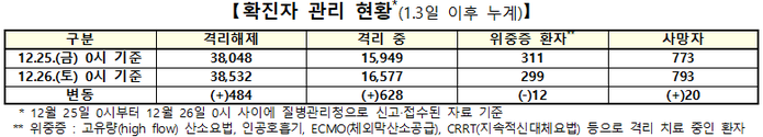 ▲ 26일 0시 기준 코로나19 격리 및 사망자 현황. [출처= 중앙방역대책본부] |