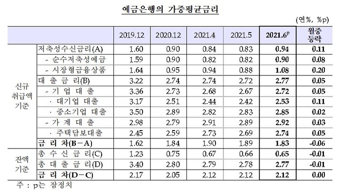 한국은행이 29일 발표한 금융기관 가중평균금리를 보면 예금은행의 6월 가계대출 금리(신규취급액 기준)는 전달대비 0.03%p 상승한 2.92%였다.