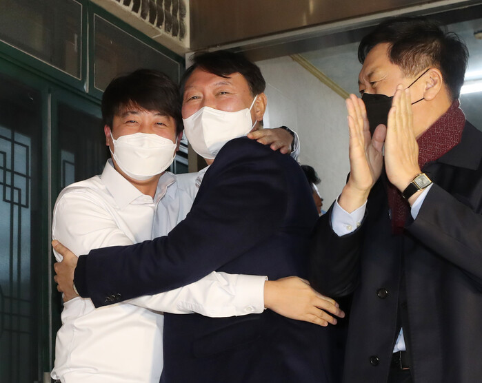 ▲ 국민의힘 윤석열 대선 후보와 이준석 대표가 3일 오후 울산시 울주군 한 식당에서 만찬 회동 후 포옹하고 있다. [울산=연합뉴스] |