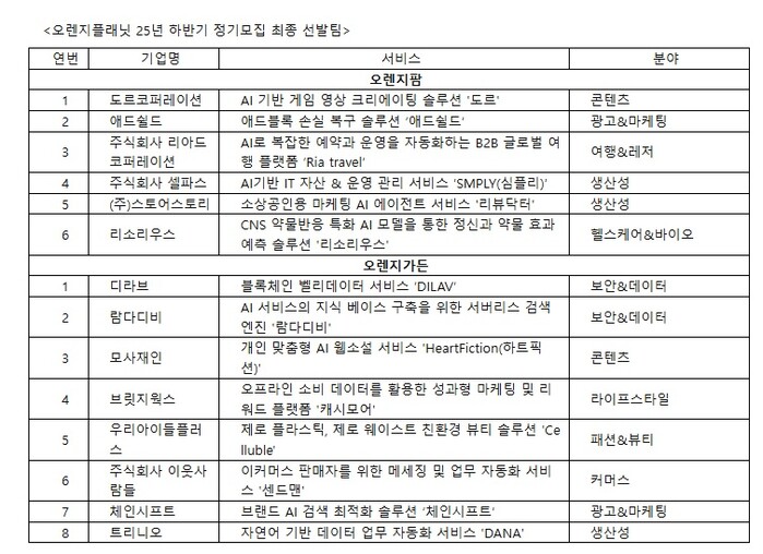 오렌지플래닛은 서류 평가, 인터뷰, 발표 등을 거쳐 실행력과 성장 가능성을 갖춘 스타트업을 선발했다. 스마일게이트인베스트먼트도 선발과정에 참여해 초기 투자를 검토했다.