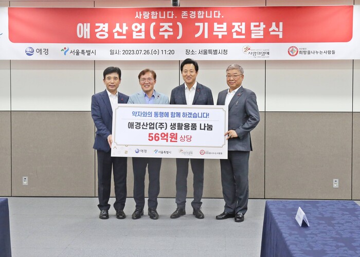 애경산업은 서울시 취약계층을 위해 56억원 상당의 세탁세제, 샴푸, 치약 등 생활용품과 화장품을 서울시에 전달했다. 지원된 제품은 (사)희망을나누는사람들을 통해 여성자립시설 등 서울시 25개구에 소재한 570여개의 사회복지기관에 전달될 예정이다.