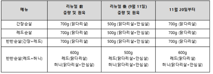 교촌치킨은 지난 9월 11일 맛과 품질을 개선하기 위해 순살 신메뉴 10종을 출시하면서, 기존 순살 메뉴 4종을 중량 500g, 국내산 닭다리살과 안심살 혼합 구성으로 리뉴얼 출시했다.